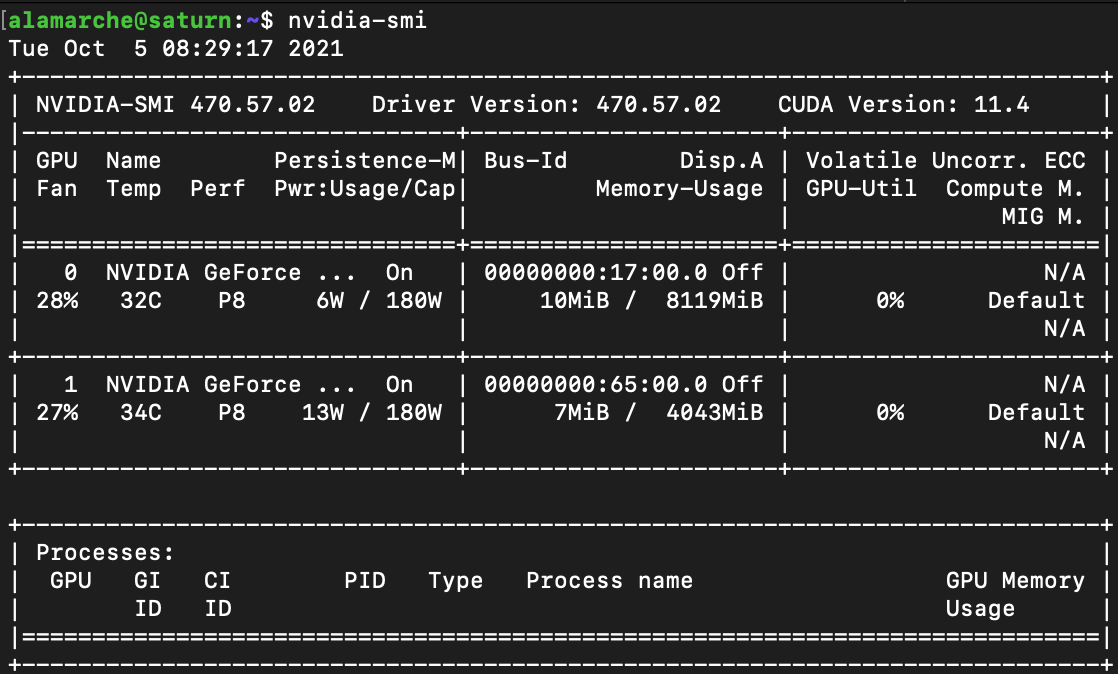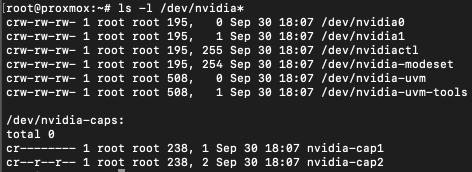 Additionally, we should be able to see two cards at /dev/nvidia0 and /dev/nvidia1. Let’s make a note of the 5th column, 195 and 508. These are known as the cgroup values.