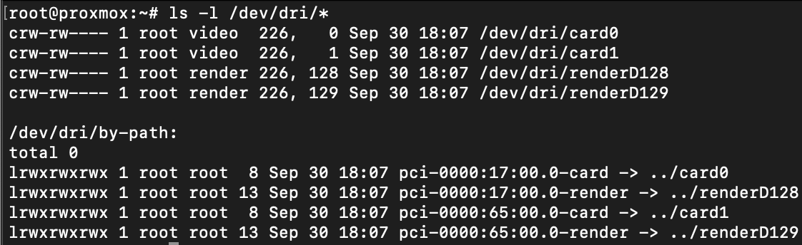 Further, since we’re going to be transcoding, let’s check /dev/dri for our rendering devices as well. Again, let’s make a note of the 5th column, 226. Please note that these numbers will likely be different for your machine, and may change if/when a driver is updated. You may need to update your container configs after a driver update.